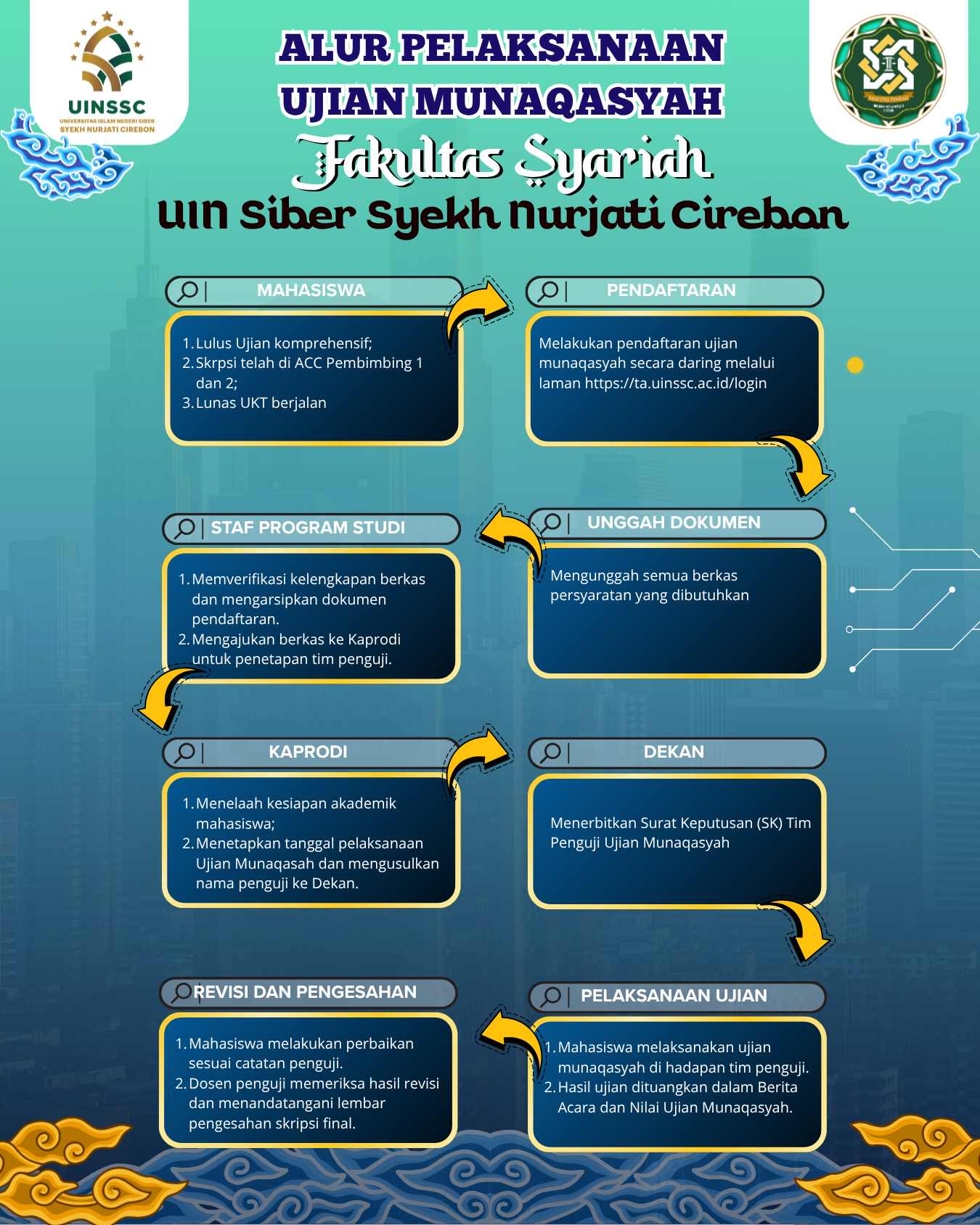 Agar proses berjalan tertib dan transparan, berikut alur pelaksanaan ujian munaqasyah yang berlaku di Fakultas Syariah: